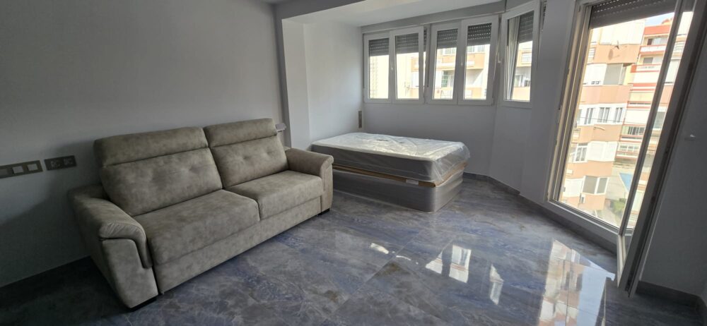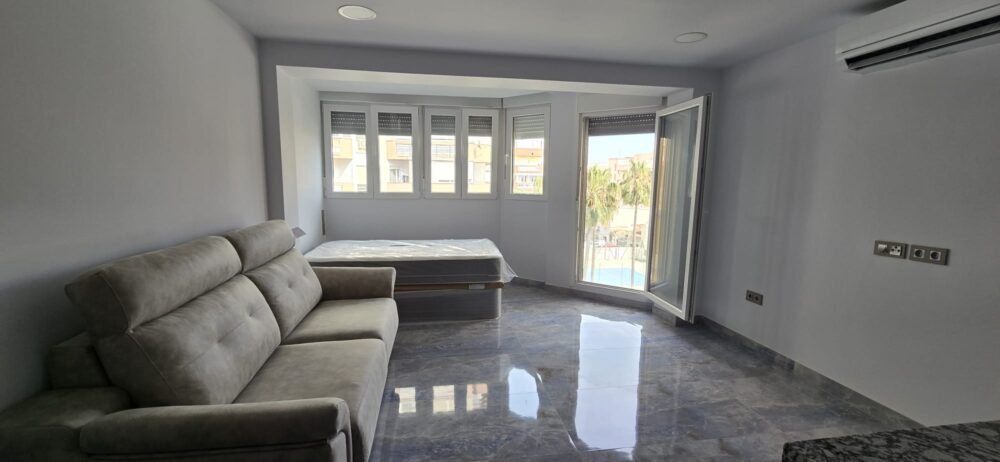 Estudio. 36 m2. TOTAL MENTE REFORMADO. 1 baño con plato de ducha. Cocina habierta al salón. 1 cama de 1,05 con canapé. 1 sofá cama de 1,35. TODO A ESTRENAR. Aire acondicionado **frío/calor**. Zonas comunes de piscina y pista de tenis. a 100 metros del paseo marítimo. Nada mejor que hacer una visita y verlo en persona.