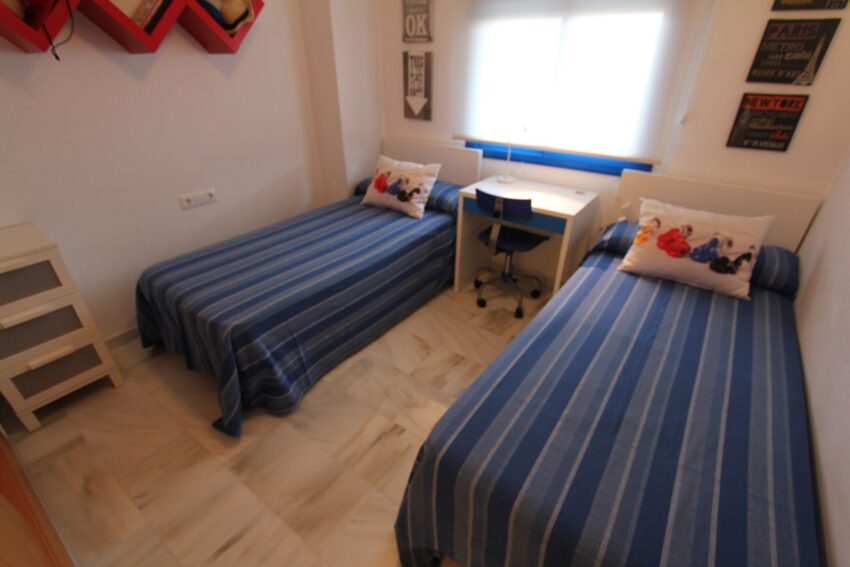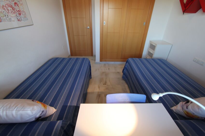 Apartamento de 2 dormitorios. Zona nueva SUB-T12. 5ª planta con 2 ascensores. 80 m2. 1 cama doble y armario empotrado y dos camas individuales. 1 baño con bañera. 1 baño con plato de ducha. Salón comedor con terraza orientada al Este (Sol de mañana). Aire Acondicionado. Cocina independiente. Vitroceramica, horno, microondas, lavavajillas. Lavadero. Todo eléctrico. Plaza de aparcamiento. NO Animales. INSTALACIÓN DE WIFI (cuotas según tarifa). Estancia mínima de 6 meses. PROHIBIDO FUMAR.