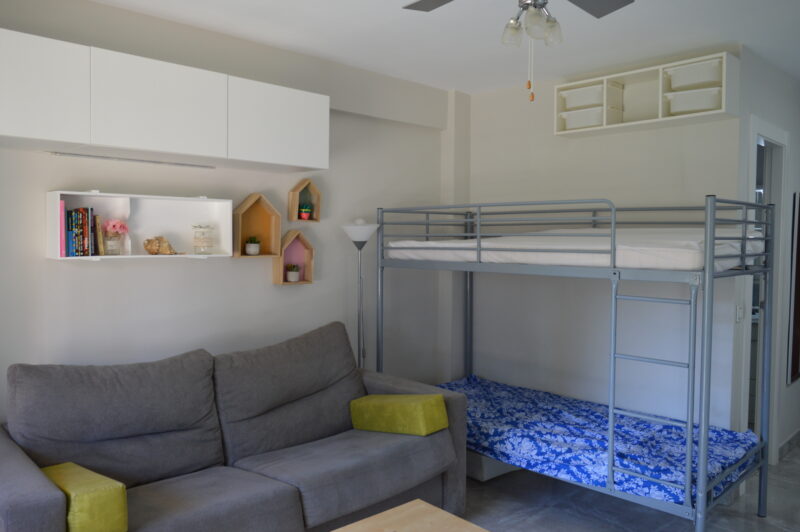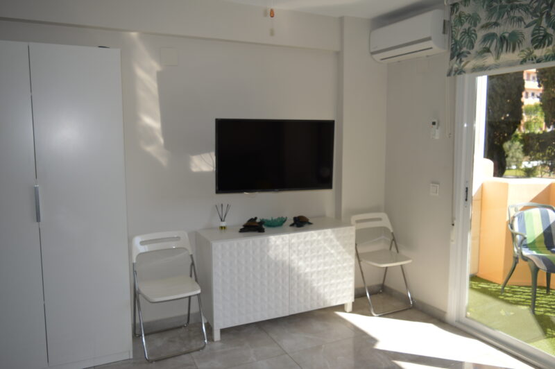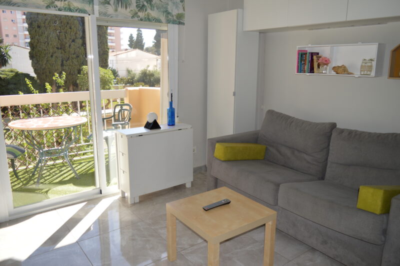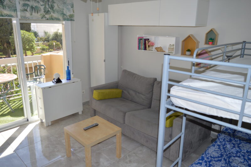 Estudio en Avda. Toré Toré. 1ª planta. Ascensor. 35 m2. 1 baño con plato d ducha. Cocina abierta al salón. Salón con aire acondicionado frío/calor. Sofá cama y una litera. Terraza abierta. Orientación Oeste (sol de tarde). Instalación de wifi (cuotas no incluidas en la renta). Zona muy tranquila y con vistas al jardín. Zonas comunes de piscina y pista de tenis. Muy cercano a los comercios de diario y a la estación de autobuses. No animales. Prohibido fumar.