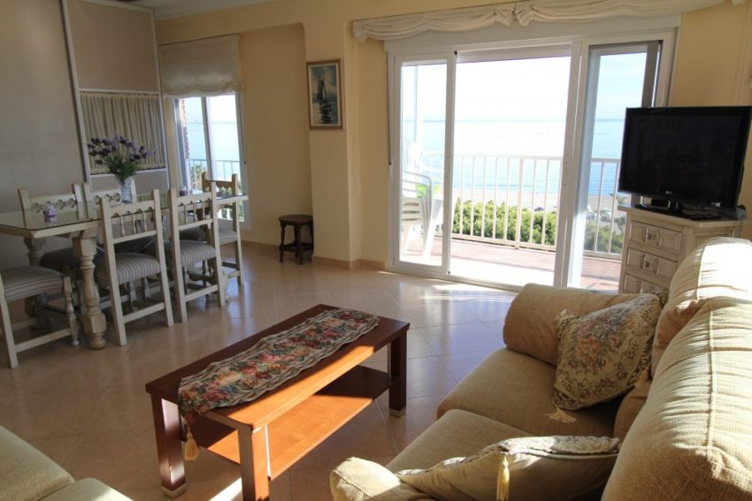 Magnífico piso en 1ª LINEA DE PLAYA (frontal al mar). Todo reformado. 80 m2. 7ª planta con ascensor. Vistas al mar. SOL TODO EL DíA. Orientación Sur- oeste. 2 dormitorios con armarios empotrados, dispone de 1 cama doble y 2 individuales. Cocina grande e independiente con lavavajillas, vitroceramica , microondas. Amplio salón comedor con aire acondicionado frío*/calor. 2 baños con plato de ducha. Terraza abierta con toldo. No se admiten animales. Tiene la instalación de wifi (cuotas a parte). A 5 minutos andando al centro. PROHIBIDO FUMAR.